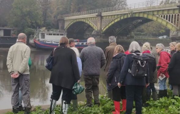 For the past few years, The Kew Society has been delighted to offer its members an annual draw-off of the tidal Thames walk Richmond to Ham. The draw-off occurs when Richmond Lock remains open to allow river water to flow out with the tides to the mouth of the Thames – giving time for maintenance of the lock, weirs and sluices.